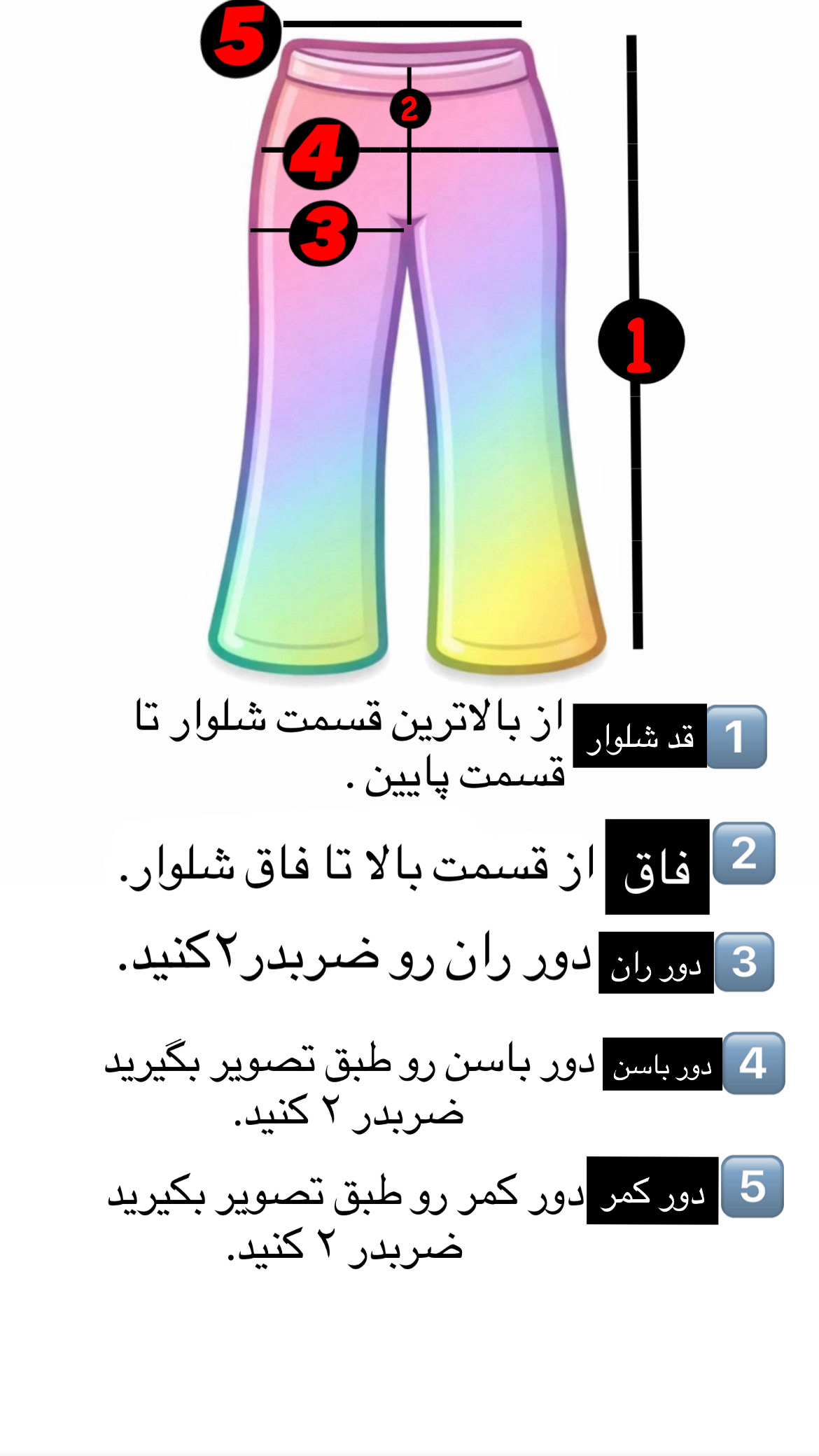 ابعاد: (قد کار۱۱۰)(دور ران۶۴)(دور باسن۱۱۰)(اندازه فاق۳۷)(دور کمر بدون کشسانی۷۰)